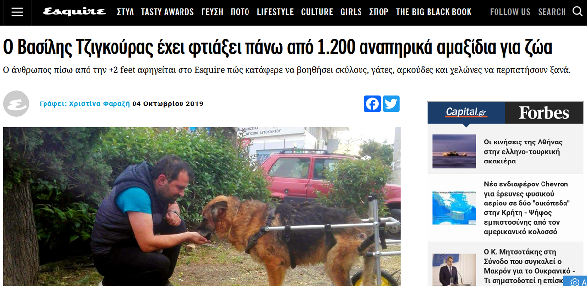 Esquire – Ο Βασίλης Τζιγκούρας έχει φτιάξει πάνω από 1.200 αναπηρικά αμαξίδια για ζώα